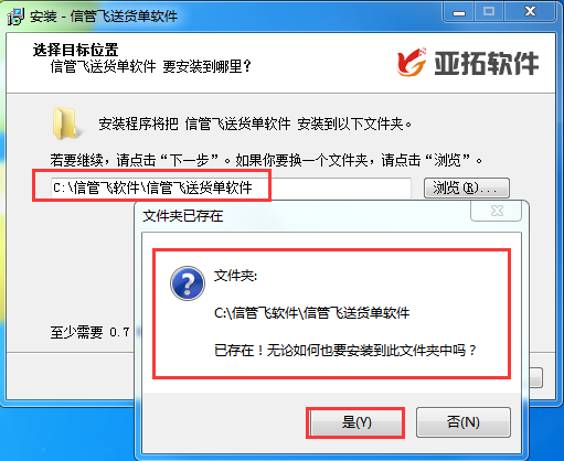 ????刪除后邊重復的內容,點擊下一步,會提示文件夾中已存在軟件,是否繼續安裝在此文件夾,點擊“是”表示覆蓋安裝到之前的文件夾中。如下圖所示: