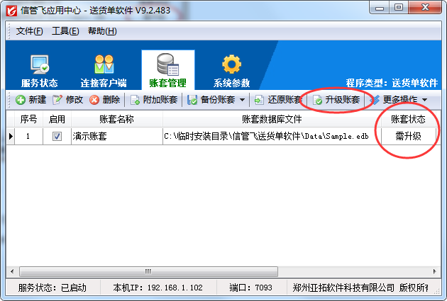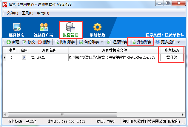 ????本文章以信管飛送貨單軟件為例,示范升級版本后賬套如何升級操作。軟件升級的版本可以直接在官網上下載最新版本,然后覆蓋安裝在原路徑中。安裝完成后,打開應用中心程序,可以在賬套管理中看到賬套狀態為“需升級”狀態。升級賬套有以下兩種方法。