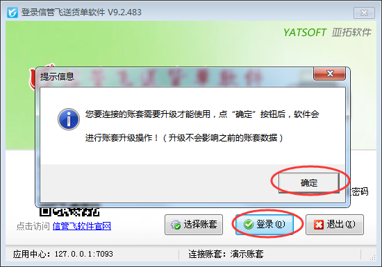 ????二、直接登錄客戶端程序進行升級;新版本安裝完成后,直接打開客戶端程序,點擊“登錄”按鈕會提示“您連接的賬套需要升級才能使用,點“確定”按鈕后,軟件會進行賬套升級操作!(升級賬套不會影響之前的賬套數據)”,點擊“確定”后可直接升級賬套。如下圖所示: