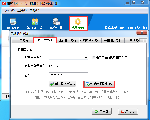 ????2、點擊“系統參數”,在“數據庫參數”頁點擊“智能修改軟件環境”。(也可點擊菜單“幫助----智能修復軟件環境”)