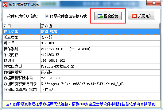 ????3、進入智能修改軟件環境窗口,點擊“智能修復”即可,修復完成,請重新啟用“信管飛RMS應用中心”。