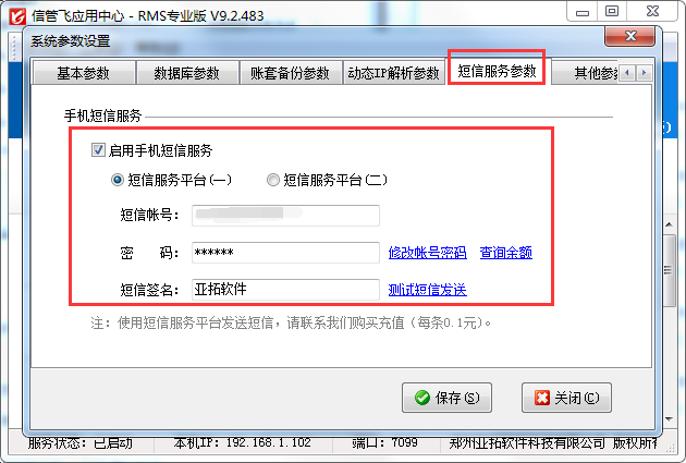 ????打開信管飛RMS軟件應用服務中心—》系統參數—》短信服務參數,如下圖所示。