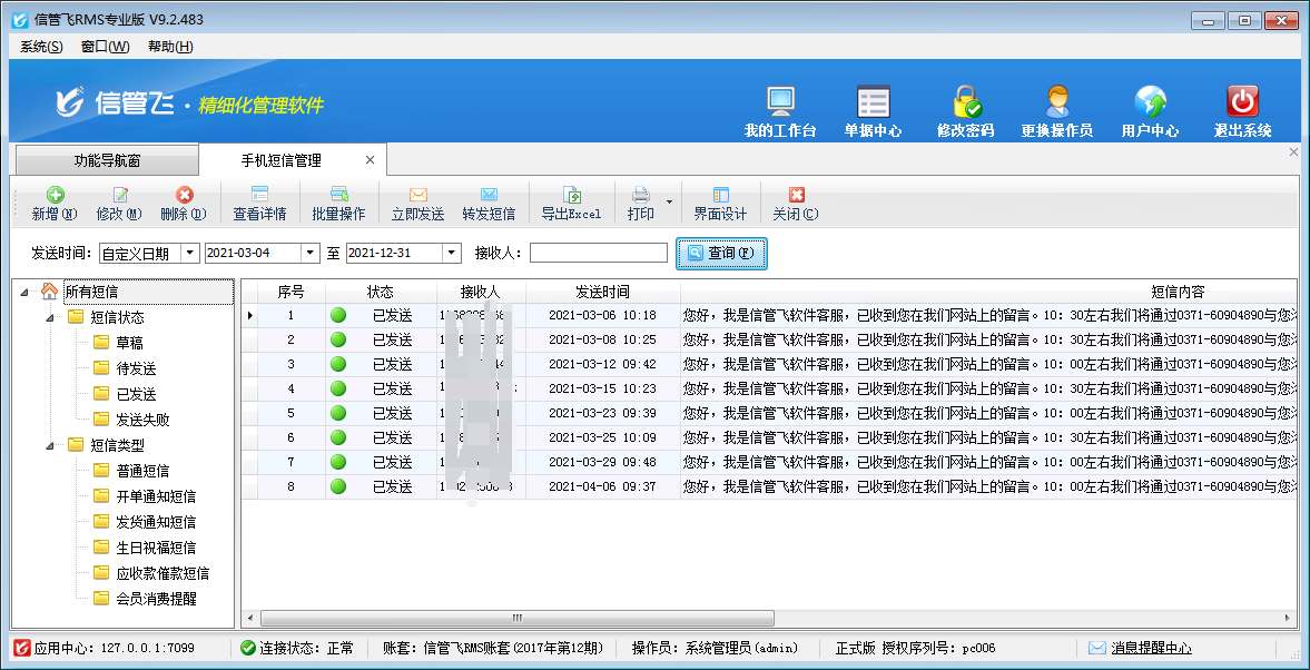 ????信管飛RMS專業版、標準版、星光版都是支持手機短信功能,我們可以根據自己的業務需求選擇相應的版本,下面我們以信管飛RMS專業版為例介紹一下手機短信功能的使用方法及步驟: