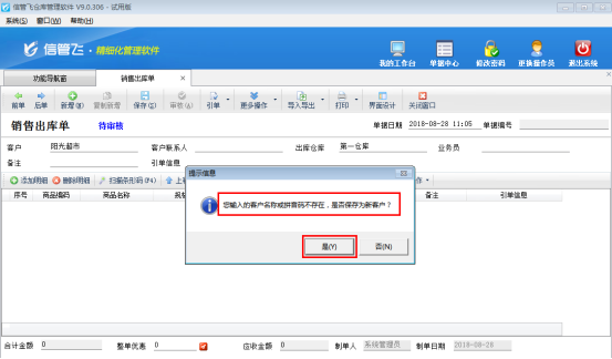 ????此時我們即可到銷售或采購業務單據開單界面上進行直接錄入新客戶/供應商的操作,我們以開銷售出庫單為例來演示一下具體操作流程。在銷售出庫單上面輸入新客戶的名稱,然后鼠標點一下其他任意一個輸入框,軟件中會提示“您輸入的客戶名稱或拼音碼不存在,是否保存為新客戶?”這時我們點擊“是”即可,填寫銷售出庫單的其他信息后保存單據,具體的操作界面如圖2所示。然后在“基礎資料”—》“客戶信息”里面可以查看到剛才新增的客戶信息。