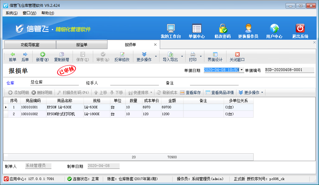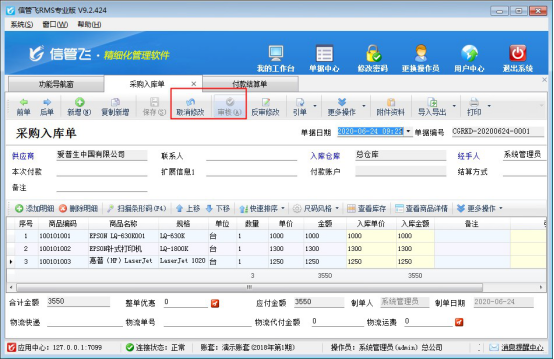 ????信管飛RMS(進銷存管理軟件)、信管飛倉庫管理軟件中業務單據已審核后默認是不允許刪除的,如下圖所示,刪除按鈕為灰色的,不可操作,那么如果單據審核后發現此單做錯了,需要刪除,如何操作呢?本篇文章詳細介紹一下倉庫管理軟件內如何刪除已審核的業務單據?