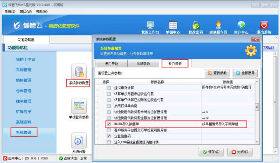 ????在功能導航窗點擊“系統管理”—》“系統參數配置”,進入系統參數配置界面,點擊“業務參數”,勾選“銷售(采購)退貨單可引用訂單”參數,點擊保存按鈕,如下圖所示: