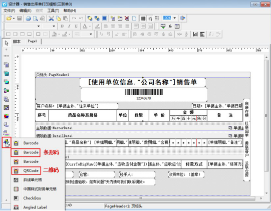 ????單據(jù)確認開單后,可打印出單據(jù)編號的條形碼發(fā)給倉庫人員,條形碼可在打印模板中進行設(shè)置,開單界面打印按鈕下點擊打印格式設(shè)計,在打印格式設(shè)計界面點擊“設(shè)計格式”,進入模板設(shè)計器界面,點擊左側(cè)工具欄的最后一個圖標,選擇第二個“Barcode”后在模板上添加文本框,然后雙擊打開文本框,彈出的條碼編輯器中代碼取“單據(jù)主體-單據(jù)編號”、條碼類型取“Code128”(二維碼選擇“QRCode”;二維碼直接雙擊選擇數(shù)據(jù)項單據(jù)主體-單據(jù)編號),設(shè)置好后點擊確定,然后預(yù)覽模板可顯示單據(jù)編號的條形碼信息。如下圖所示: