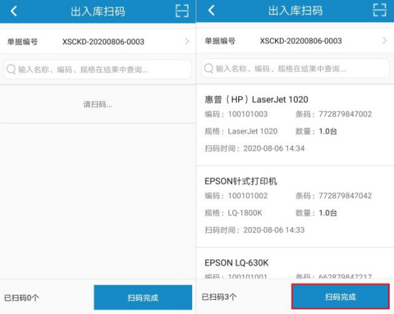 ????出入庫掃碼界面,點擊右上角掃描圖標,然后掃描單據(jù)編號的條形碼,掃碼后自動進入掃描商品信息界面,繼續(xù)點擊掃描圖標,針對商品的條形碼進行掃描,會自動獲取商品信息到出入庫掃碼界面,(默認掃描數(shù)量為1,如存在出庫多個相同商品,可掃描多次)掃描完成后點擊“掃碼完成”,如下圖所示:
