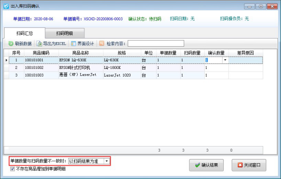 ????以上操作完成后,打開電腦開單界面,在更多操作下點擊“倉庫掃碼確認”,進入出入庫掃碼確認界面,如一致則黑體顯示(掃碼數(shù)量大于單據(jù)數(shù)量和掃碼商品單據(jù)中不存在是藍色顯示),點擊“確認結(jié)果”,彈出提醒界面,掃碼數(shù)量和出庫數(shù)量一致可直接點擊“確定”,確定后,刷新出庫單界面,掃碼狀態(tài)為“已掃碼”,顯示掃碼數(shù)量,然后開單人員直接審核單據(jù),出庫操作就此完成,如下圖所示:
