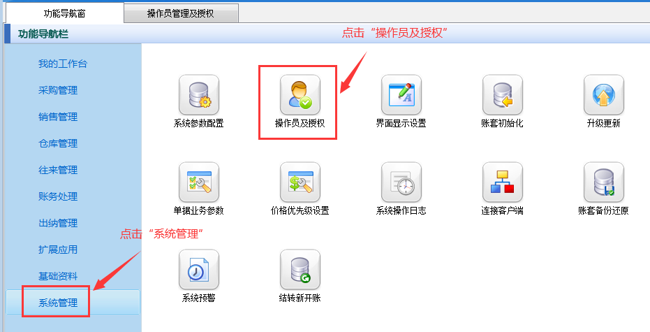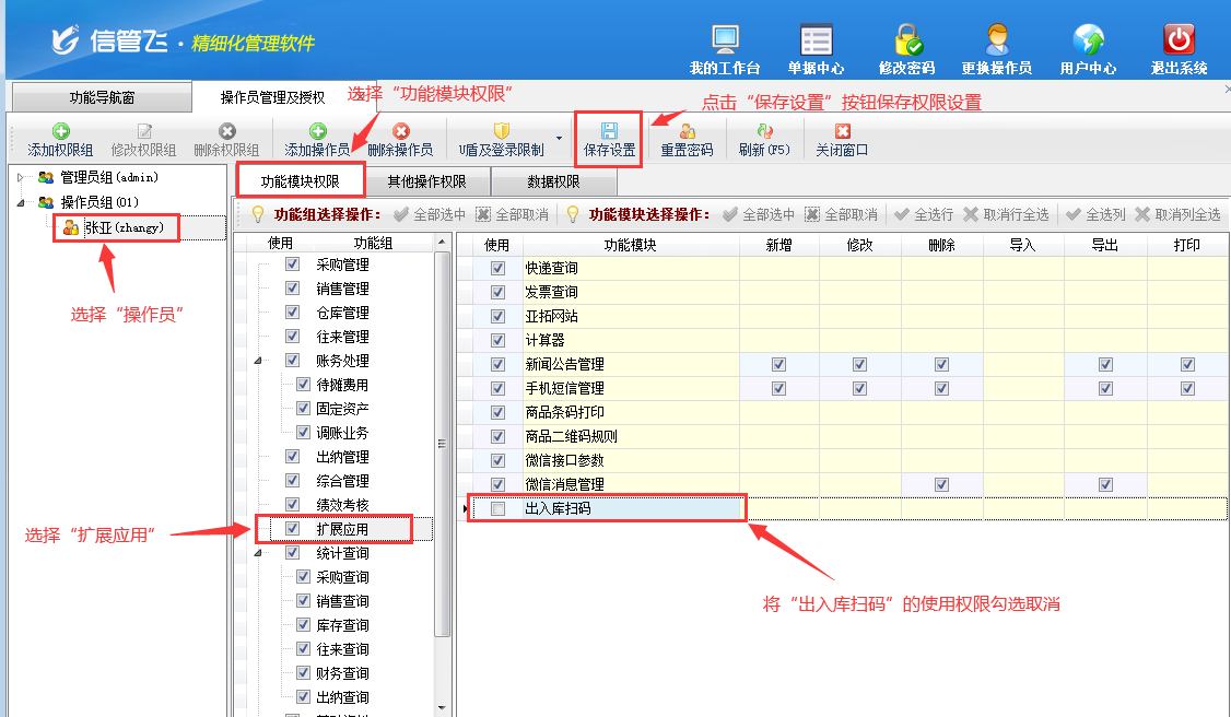 ????在功能導(dǎo)航窗點擊“系統(tǒng)管理”—》“操作員及授權(quán)”,進入“操作員管理及授權(quán)”界面,選擇操作員“張亞”,在其右側(cè)的功能模塊權(quán)限內(nèi)選擇“擴展應(yīng)用”模塊,將出入庫掃碼的“使用”權(quán)限勾選取消,然后保存設(shè)置,如下圖所示。