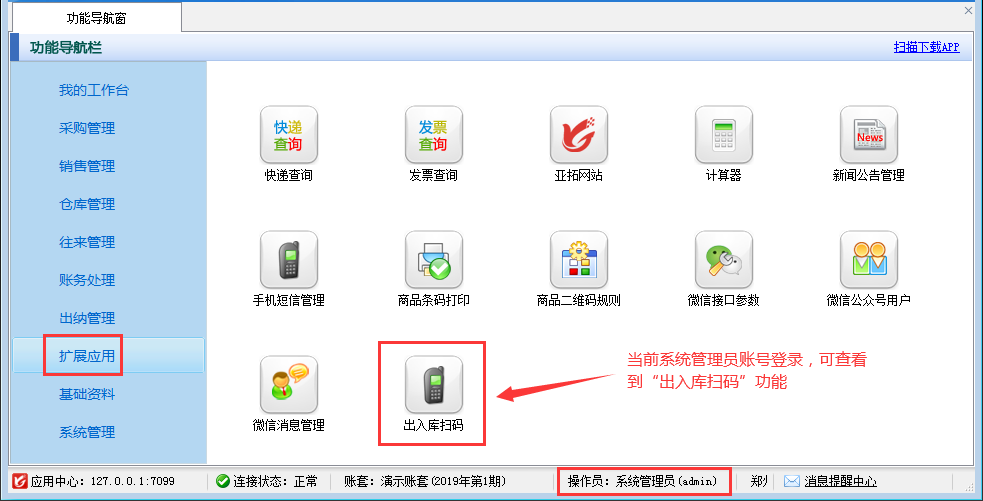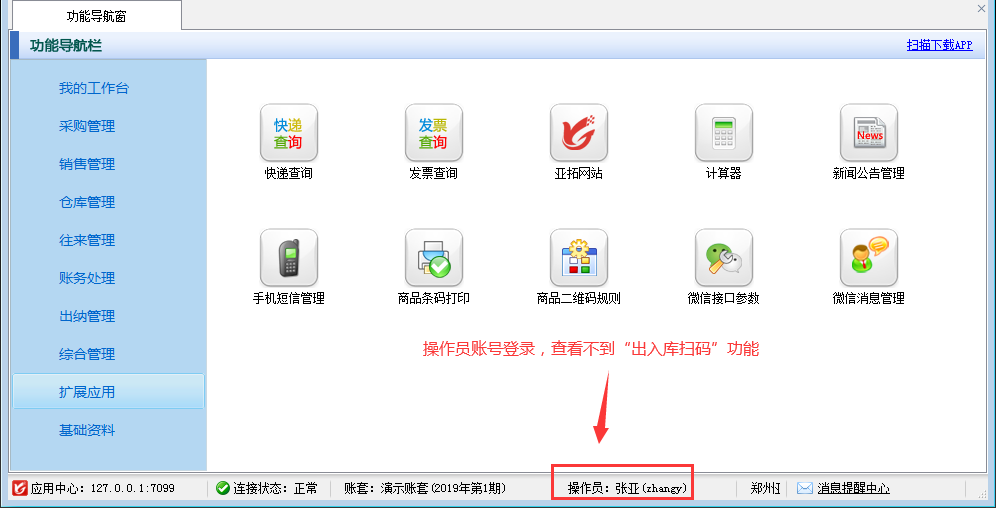 ????操作員權(quán)限設(shè)置完成后,使用操作員“張亞”登錄軟件,打開擴展應(yīng)用模塊,可以看到操作員已無法查看到“出入庫掃碼”功能,如下圖所示。
