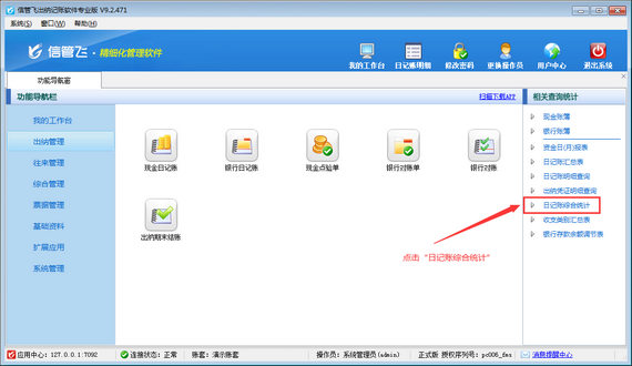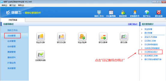 ????然后在“出納管理”模塊最右側(cè)的“相關(guān)查詢統(tǒng)計”內(nèi)點(diǎn)擊“日記賬綜合統(tǒng)計”,打開“日記賬綜合統(tǒng)計”界面,如下圖所示。