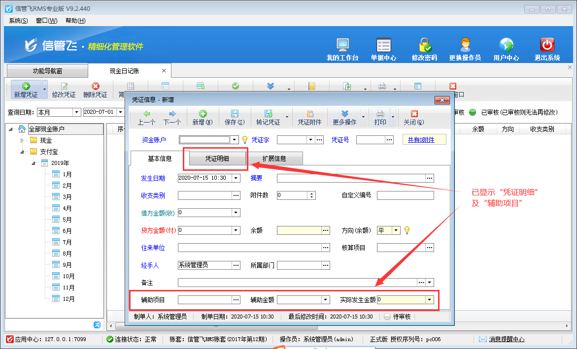 ????信管飛出納記賬軟件、信管飛RMS(標(biāo)準(zhǔn)版、專業(yè)版)中的出納管理模塊,在新增憑證中有的需要填寫輔助項目和憑證明細(xì),軟件支持設(shè)置在新增憑證時顯示這些項目。下邊以信管飛RMS為例,演示一下如何設(shè)置出納憑證啟用憑證明細(xì)和輔助項目。