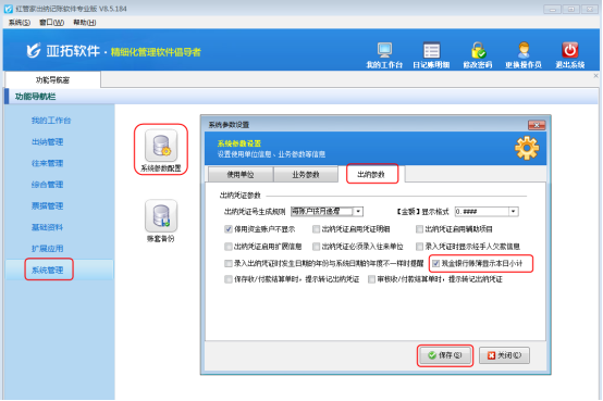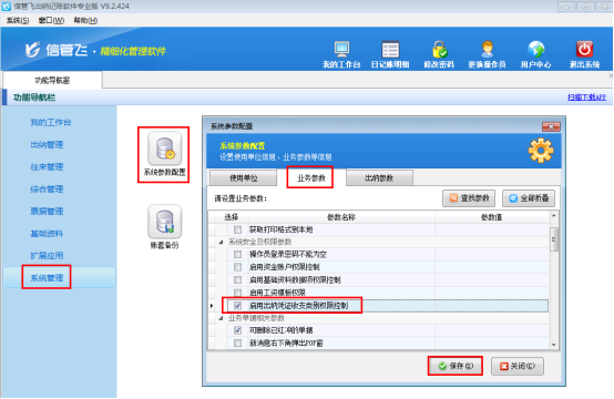 ????在功能導(dǎo)航窗點(diǎn)擊“系統(tǒng)管理”——》“系統(tǒng)參數(shù)配置”——》“業(yè)務(wù)參數(shù)”可以進(jìn)入到“業(yè)務(wù)參數(shù)”配置界面,在出納憑證相關(guān)參數(shù)內(nèi)打勾啟用“出納憑證摘要只能選擇不能隨意輸入”參數(shù),然后保存,如下圖所示: