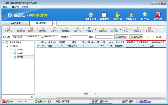 ????操作員“王偉”登錄軟件,新增一個現(xiàn)金日記賬,審核日記賬后,在日記賬列表界面,在界面設(shè)計中勾選顯示出“當(dāng)前審核環(huán)節(jié)”,可看到顯示為一審。如下圖所示: