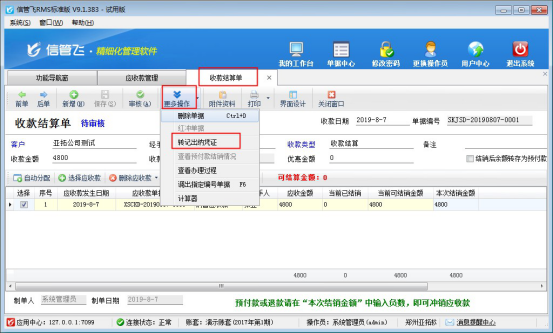 ????信管飛RMS標(biāo)準(zhǔn)版和專業(yè)版中增加了出納模塊,可以登記現(xiàn)金銀行日記賬。信管飛RMS 軟件中用戶在做收款結(jié)算后如需要把這筆賬管理到日記賬中,可以在收款時轉(zhuǎn)記到出納日記賬中。在軟件中如何操作呢?