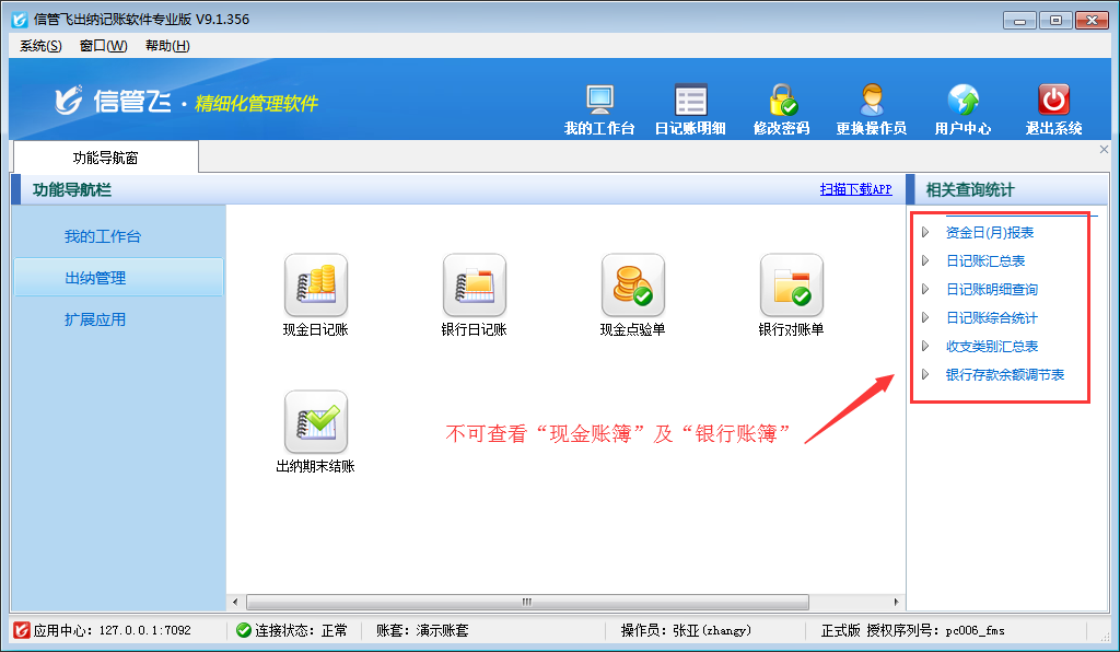 ????信管飛出納記賬軟件內(nèi)包含豐富的記賬統(tǒng)計表格,如現(xiàn)金賬簿、銀行賬簿、資金日(月)報表、收支類別匯總表等。如果不希望員工賬號登錄后導(dǎo)出這些報表,如何設(shè)置呢?本篇文章以信管飛出納記賬軟件專業(yè)版為例演示一下出納記賬軟件內(nèi)如何設(shè)置操作員不可導(dǎo)出現(xiàn)金及銀行賬簿。