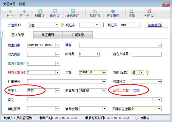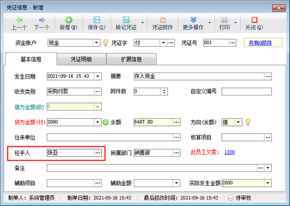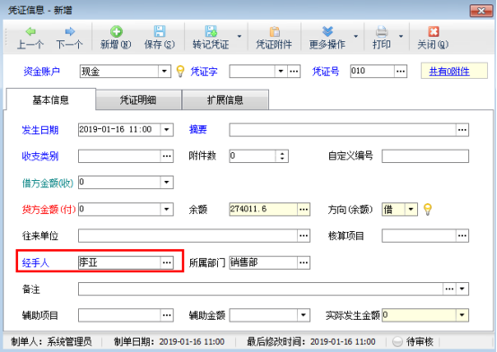 ????在功能導(dǎo)航窗點(diǎn)擊“出納管理”—》“現(xiàn)金日記賬”,新增日記賬憑證時選擇一下經(jīng)手人信息,如下圖所示。