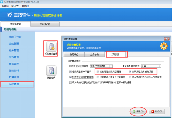 ????在功能導(dǎo)航窗點(diǎn)擊“系統(tǒng)管理”—》“系統(tǒng)參數(shù)配置”—》“出納參數(shù)”打開出納參數(shù)配置界面,然后啟用參數(shù)“出納憑證啟用憑證明細(xì)”、“出納憑證啟用輔助項目”,如下圖所示。