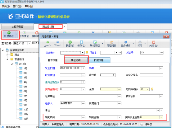 ????參數(shù)啟用后,在功能導(dǎo)航窗點(diǎn)擊“出納管理”—》“現(xiàn)金日記賬”打開現(xiàn)金日記賬界面,新增日記賬,在新增憑證界面即可顯示“輔助項目”、“憑證明細(xì)”,如下圖所示: