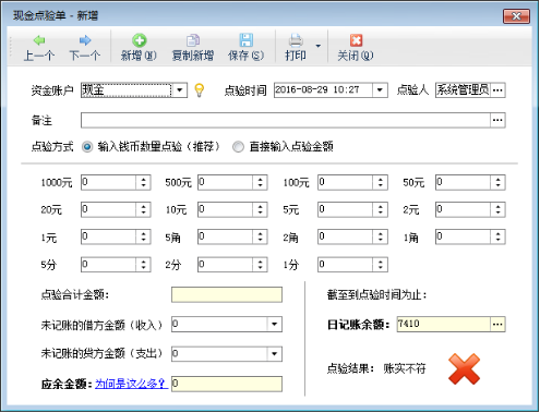 點(diǎn)驗(yàn)結(jié)果:系統(tǒng)會自動獲取截止到點(diǎn)驗(yàn)時間為止相應(yīng)賬戶內(nèi)的日記賬余額,如果“應(yīng)余金額”與“日記賬余額”一致時,點(diǎn)驗(yàn)結(jié)果為“賬實(shí)相符”,如果“應(yīng)余金額”與“日記賬余額”不一致時,點(diǎn)驗(yàn)結(jié)果為“賬實(shí)不符”。