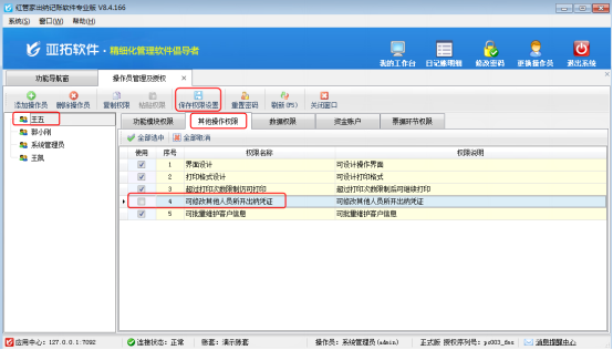 ????系統(tǒng)管理員登錄軟件,在功能導(dǎo)航窗點(diǎn)擊“系統(tǒng)管理”—》“操作員及授權(quán)”,進(jìn)入“操作員管理及授權(quán)”界面,如下圖所示,選擇一個操作員,以操作員“張亞”為例,點(diǎn)擊“其他操作權(quán)限”,然后取消勾選“可修改其他人員所開出納憑證”,最后點(diǎn)擊“保存權(quán)限設(shè)置”,權(quán)限設(shè)置成功。