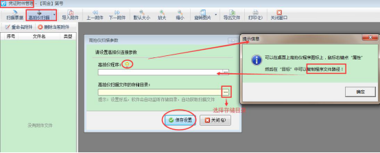 ????在紅管家出納記賬軟件中,進(jìn)入附件管理窗口,點(diǎn)“高拍儀掃描”-》“高拍儀掃描參數(shù)配置”,配置高拍儀程序以及掃描文件存儲目錄,如下圖所示: