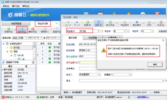 ????期末結(jié)賬后,在功能導(dǎo)航窗,點(diǎn)擊“出納管理”——》“現(xiàn)金日記賬”,進(jìn)入“現(xiàn)金日記賬”界面,選擇現(xiàn)金賬戶“支付寶”8月份的出納憑證(結(jié)賬會默認(rèn)把未審核的日記賬變?yōu)閷徍?,修改需要先反審為未審核狀態(tài))點(diǎn)擊“修改”按鈕,彈出的日記賬界面修改后點(diǎn)擊“保存”時會提示“當(dāng)前賬期是2021年第9期,錄入的發(fā)生日期小于賬期的起始日期,請修改后再保存”,則無法修改之前賬期的憑證。如下圖所示: