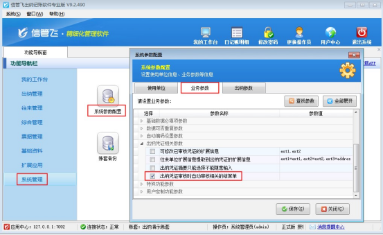 ????在“功能導(dǎo)航窗”點(diǎn)擊“系統(tǒng)管理”—》“系統(tǒng)參數(shù)配置”,啟用“業(yè)務(wù)參數(shù)”中的“出納憑證審核時自動審核相關(guān)的結(jié)算單”參數(shù),如下圖所示: