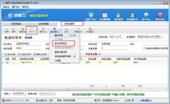 ????參數(shù)啟用完成后,在“往來管理”中打開應(yīng)收款管理,選擇狀態(tài)為“未結(jié)銷”的應(yīng)收款記錄,點(diǎn)擊收款結(jié)算,在彈出的結(jié)算單界面上,正常結(jié)算應(yīng)收款,保存結(jié)算單后在“更多操作”下點(diǎn)擊“轉(zhuǎn)記出納憑證”(需要自動提醒轉(zhuǎn)記可參考此文章設(shè)置:出納軟件如何設(shè)置結(jié)算單保存或?qū)徍藭r提醒轉(zhuǎn)記日記賬?),如下圖所示: