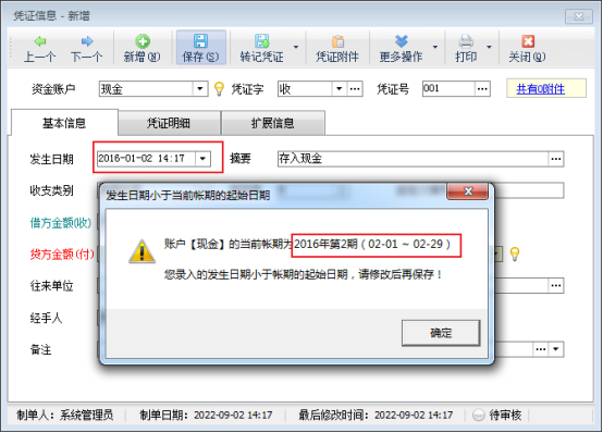 # 6.4.62 出納記賬軟件新增憑證時提示“發(fā)生日期小于當(dāng)前賬期的起始日期”,如何解決?