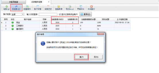 ????在功能導(dǎo)航窗點(diǎn)擊“出納管理”—》“出納期末結(jié)賬”,進(jìn)入出納期末結(jié)賬界面,選中當(dāng)前使用賬戶,點(diǎn)擊反結(jié)賬按鈕,反結(jié)賬完成后,相應(yīng)賬戶回退到上一個賬期,賬期的起始日期是2016-01-01,如下圖所示: