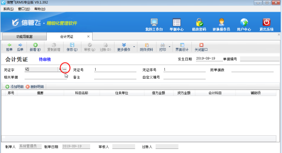 ????登錄軟件,在功能導航窗點“財務處理”—》“會計憑證”,然后打開新增會計憑證界面,點擊憑證字后面的“...”按鈕,如下圖所示: