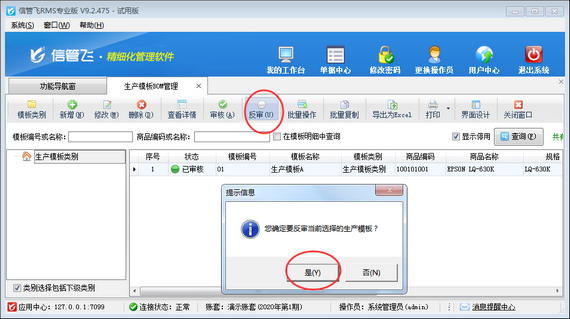 ????在生產模板BOM管理界面,選擇一個已審核的生產模板,在工具欄中點擊“反審”按鈕,系統彈出提示信息“您確定要反審當前選擇的生產模板?”,然后點擊“是”按鈕對已審核的生產模板進行反審操作,如下圖所示。