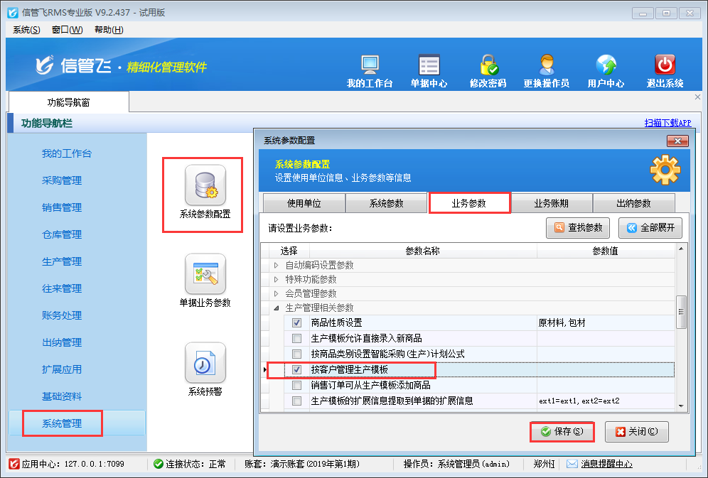 ????在功能導航窗點擊“系統管理”—》“系統參數配置”—》“業務參數”打開業務參數配置界面,然后在生產管理相關參數中打鉤啟用“按客戶管理生產模板”參數,然后點擊“保存”按鈕保存參數配置,如下圖所示。