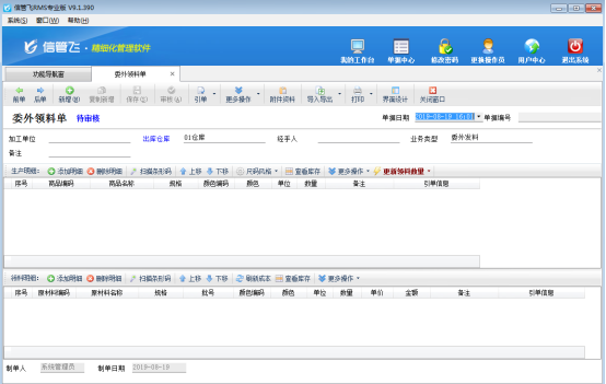 ????(2)當需要加工廠進行加工時,開“委外加工單”錄入加工任務,會根據生產模板自動算出需要的原材料明細。