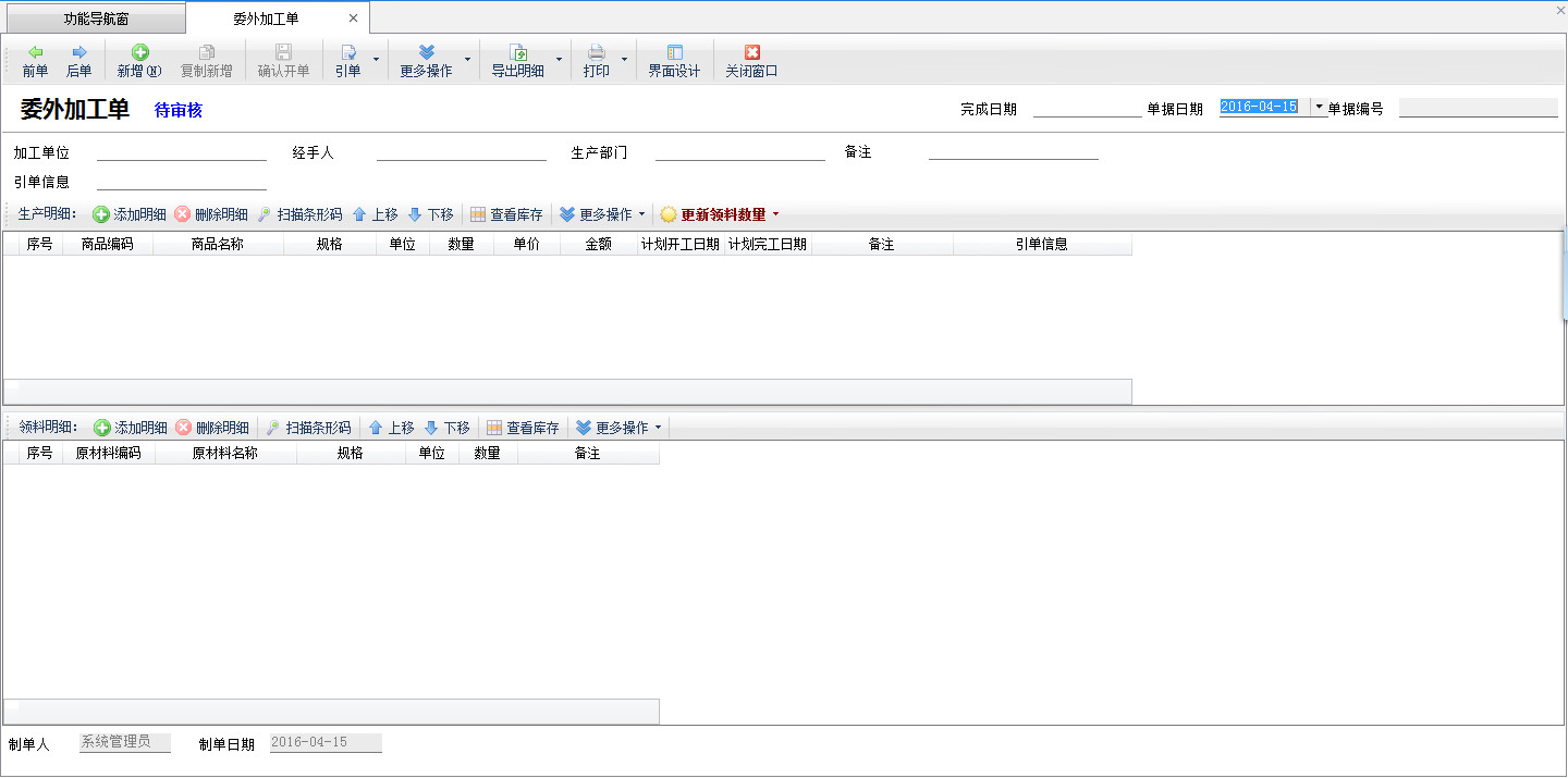 ????委外加工明細:可以通過引用銷售訂單或生產計劃單的方式,快速錄入加工產品明細。