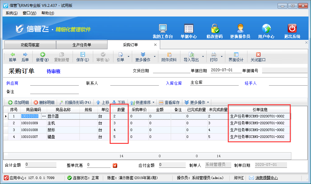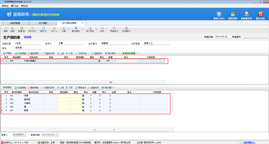 ????單據明細:引用或輸入生產商品明細后,只需要錄入“數量”,其他數量由后續業務單據引用生成任務單后,自動更新。
