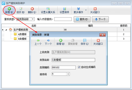 ????模板類別:可以維護模板類別,后續可以按照模板類別管理生產模板。點工具欄中的“模板類別”按鈕會彈出“生產模板類別維護”的界面,在此界面上點“新增”按鈕可以進增加類別信息的操作,如圖2所示。