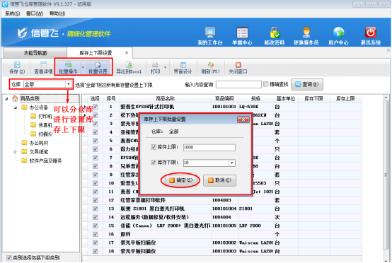 信管飛倉(cāng)庫(kù)管理軟件、信管飛RMS支持庫(kù)存管理功能,為了更直觀的發(fā)現(xiàn)庫(kù)存數(shù)量,軟件中可以對(duì)商品庫(kù)存數(shù)量進(jìn)行庫(kù)存上下限設(shè)置,并可以在倉(cāng)庫(kù)管理模塊中的“相關(guān)查詢(xún)統(tǒng)計(jì)”中進(jìn)行庫(kù)存預(yù)警查詢(xún)。以信管飛倉(cāng)庫(kù)管理軟件為例,我們介紹一下如何設(shè)置庫(kù)存的上下限數(shù)量。 在功能導(dǎo)航窗選擇“倉(cāng)庫(kù)管理”—》“庫(kù)存上下限設(shè)置”進(jìn)入庫(kù)存上下限設(shè)置界面,如圖1所示:圖1 以下為“庫(kù)存上下限設(shè)置”的功能操作說(shuō)明: (1)可以選擇倉(cāng)庫(kù),默認(rèn)為“全部”即所有倉(cāng)庫(kù)的預(yù)警上下限。也可以選擇一個(gè)具
