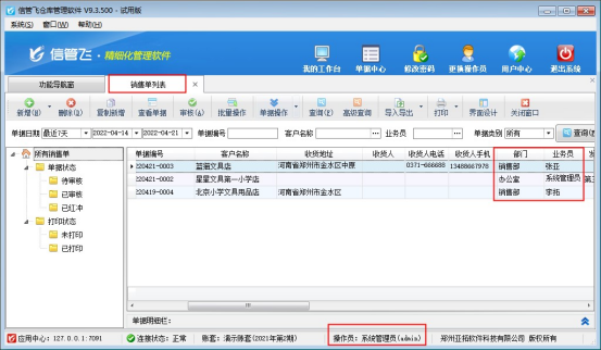 信管飛倉庫管理軟件、信管飛送貨單軟件、信管飛RMS軟件,都支持設(shè)置多個操作員并對操作員進行權(quán)限控制,通過設(shè)置操作員的“數(shù)據(jù)權(quán)限”,可以更精細的控制操作員對業(yè)務(wù)單據(jù)的查看權(quán)限。有用戶需要操作員只能查看本部門人員單據(jù),以“信管飛倉庫管理軟件”為例,示范下如何操作? 示例:操作員“系統(tǒng)管理員”和操作員“張亞”分別屬于部門“辦公室”和“銷售部”使用操作員“系統(tǒng)管理員”登錄軟件,在功能導(dǎo)航窗點擊“系統(tǒng)管理”—》“操作員管理及授權(quán)”進入“操作員管理及授權(quán)”界面,在此界面可以增加操作員以及設(shè)置操作員權(quán)限,選擇操
