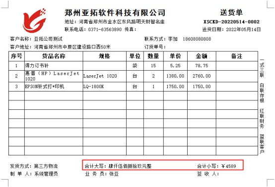 信管飛RMS軟件、信管飛送貨單軟件、信管飛倉庫管理軟件等都支持開銷售單和打印銷售單,有存在銷售合計金額有小數(shù)的情況,但是打印需要取整,該如何設(shè)置? 演示視頻觀看鏈接:打印模板合計大寫金額如何設(shè)置取整顯示? 本文以“信管飛送貨單軟件”為例,示范下打印模板如何設(shè)置合計大寫金額取整顯示,新開一個送貨單,合計金額存在小數(shù),打印預(yù)覽圖如下: 需要打印模板合計金額取整,在開單界面打印下點擊“打印格式設(shè)計”,選擇打印