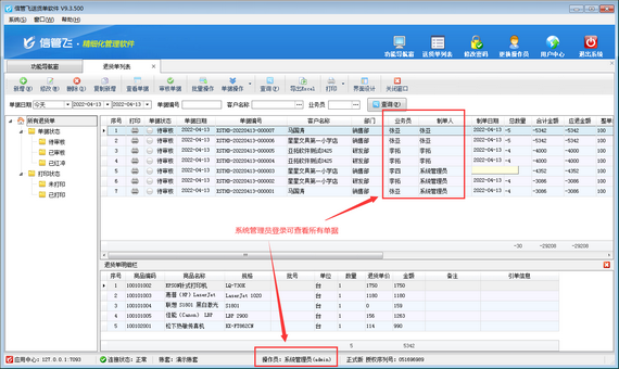 信管飛送貨單軟件是一款集訂單、送貨單、退貨單、應收款管理為一體的送貨打印軟件,軟件支持設置操作員賬號及操作員權限,本篇文章介紹一下送貨單軟件如何設置操作員只查看本人送貨單、退貨單數據? 在功能導航窗點擊“系統管理”—》“操作員及授權”,進入操作員管理及授權界面,選擇操作員“張亞”,在“數據權限”中,把“送貨單、退貨單”權限對應的“只查看本人數據”權限勾選啟用上,然后保存權限設置,如下圖所示: 權限設置完成后,使用操作員賬號登錄軟件,在送貨單列表/退貨單列表中分別查看送貨單、退貨單,可看