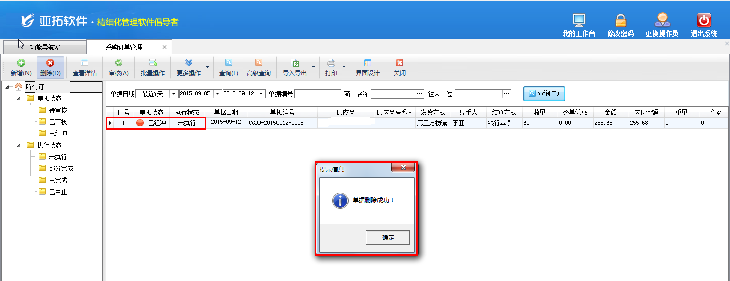 配置完之后再回到剛剛“已紅沖”的那個單據進行刪除,此時就可以刪除成功了,如下圖所示: