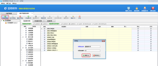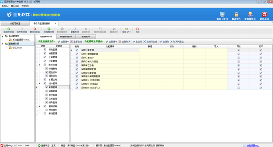 操作員及授權(quán)實(shí)現(xiàn)對(duì)操作員的管理和權(quán)限分配。權(quán)限分為功能模塊權(quán)限、明細(xì)操作權(quán)限、其他操作權(quán)限、數(shù)據(jù)權(quán)限等。不同版本的系統(tǒng)功能權(quán)限的種類是不同的,另外部分權(quán)限(如倉庫權(quán)限、資金賬戶權(quán)限)需要在“系統(tǒng)參數(shù)配置”中啟用相應(yīng)的參數(shù),才可以使用。