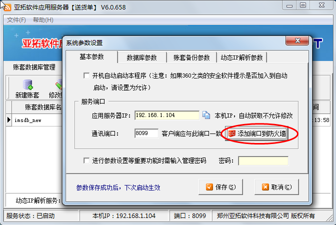 主機沒問題后,客戶端電腦有時可能無法連接主機,登錄失敗,此時請固定主機IP地址,另:打開亞拓軟件應用服務器,點“文件”——》“系統參數設置”——》“基本參數”——》“添加端口到防火墻”。(為什么需固定主機IP地址及如何固定IP地址請參見這篇文章:網絡版軟件固定主機IP地址的方法)