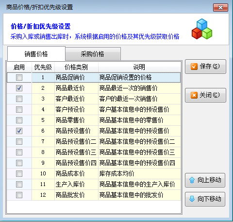 (1)對(duì)價(jià)格優(yōu)先級(jí)進(jìn)行設(shè)置,軟件中可以對(duì)銷售價(jià)格以及采購(gòu)價(jià)格進(jìn)行價(jià)格優(yōu)先級(jí)設(shè)置,可以根據(jù)自身業(yè)務(wù)特點(diǎn)進(jìn)行啟用不同的價(jià)格類型。其中打勾啟用表示生效,點(diǎn)“向上移動(dòng)”和“向下移動(dòng)”可以調(diào)整價(jià)格的優(yōu)先順序,按上一個(gè)價(jià)格策略沒(méi)有獲取到價(jià)格,則自動(dòng)按下一個(gè)價(jià)格策略獲取價(jià)格。