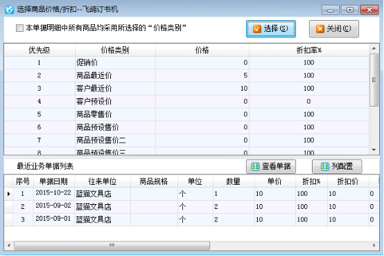 (2)我們以圖1中所設(shè)置的銷售價(jià)格啟用商品最近價(jià)、商品預(yù)設(shè)售價(jià)為例來(lái)開銷售出庫(kù)單,如下圖2而所示,當(dāng)我們選擇商品后軟件會(huì)根據(jù)啟用不同價(jià)格策略的優(yōu)先級(jí)自動(dòng)調(diào)取商品的銷售價(jià)格,這次出庫(kù)單中由于這兩種商品之前已經(jīng)銷售過(guò),所以軟件自動(dòng)調(diào)取出商品的最近價(jià)。我們可以明細(xì)欄中點(diǎn)“更多操作”—》“選擇價(jià)格”中查看不同類別的價(jià)格以及最近業(yè)務(wù)單據(jù),如下圖3所示。