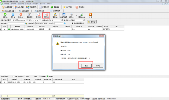 如果相應(yīng)的收款單已經(jīng)審核過(guò)了,此時(shí)刪除時(shí),系統(tǒng)會(huì)提示“當(dāng)前收款單已審核,不允許進(jìn)行刪除操作!(如確需刪除請(qǐng)先反審)”,如下圖五所示。