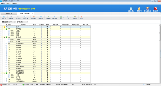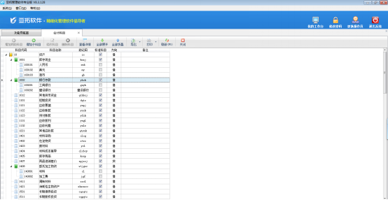 登錄亞拓管理軟件專業(yè)版,在功能導(dǎo)航窗點(diǎn)擊“基礎(chǔ)資料”—》“會計科目”,即可進(jìn)入會計科目管理界面,如圖1所示。